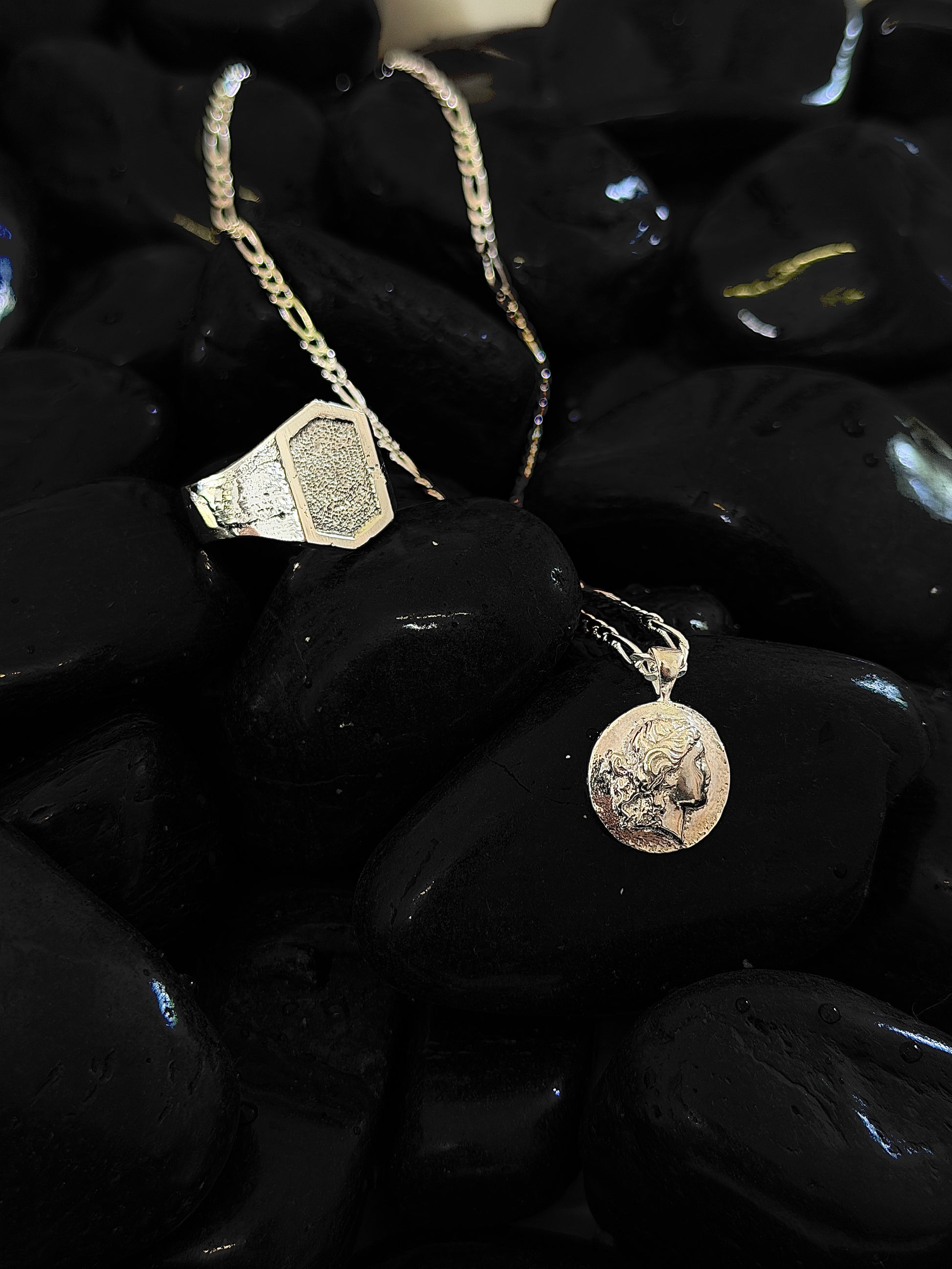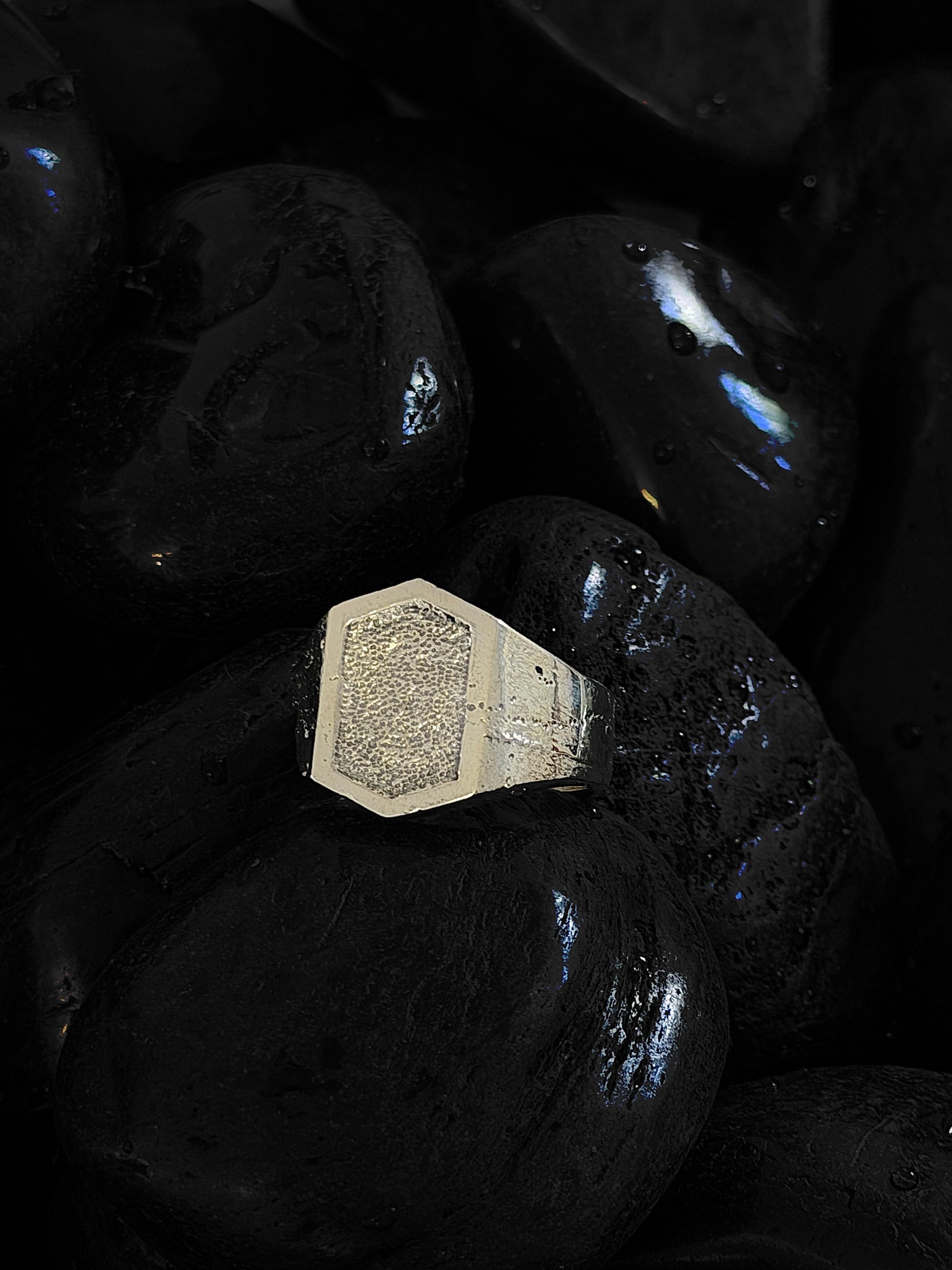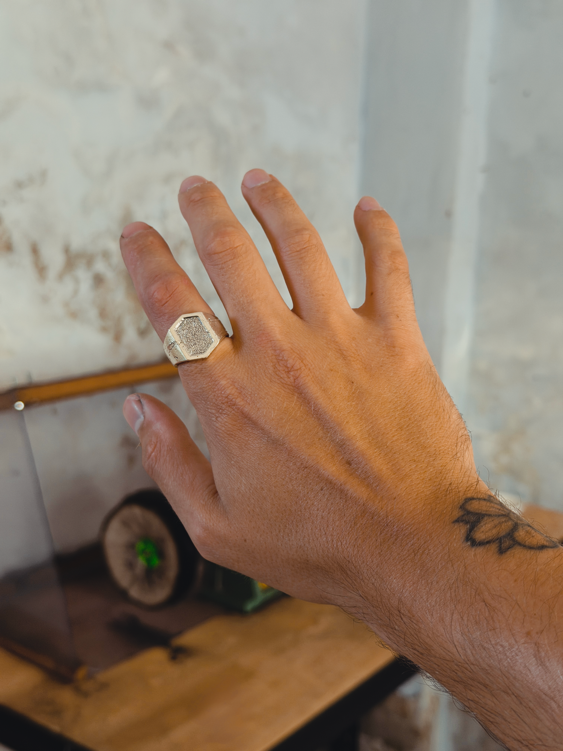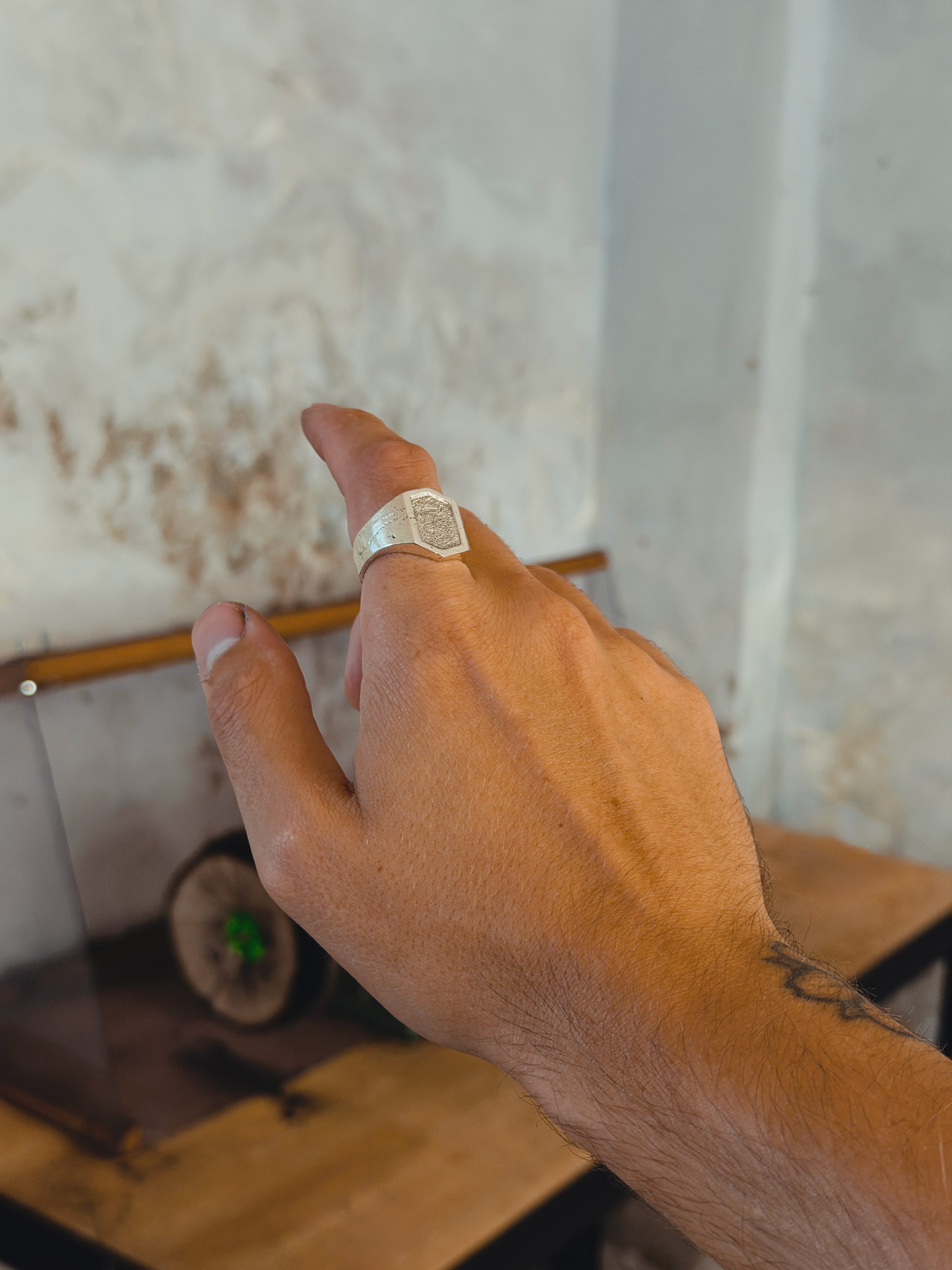 Aurelius sits low to the finger, is bold and heavy, but not overtly chunky, and bears the face of a shield.